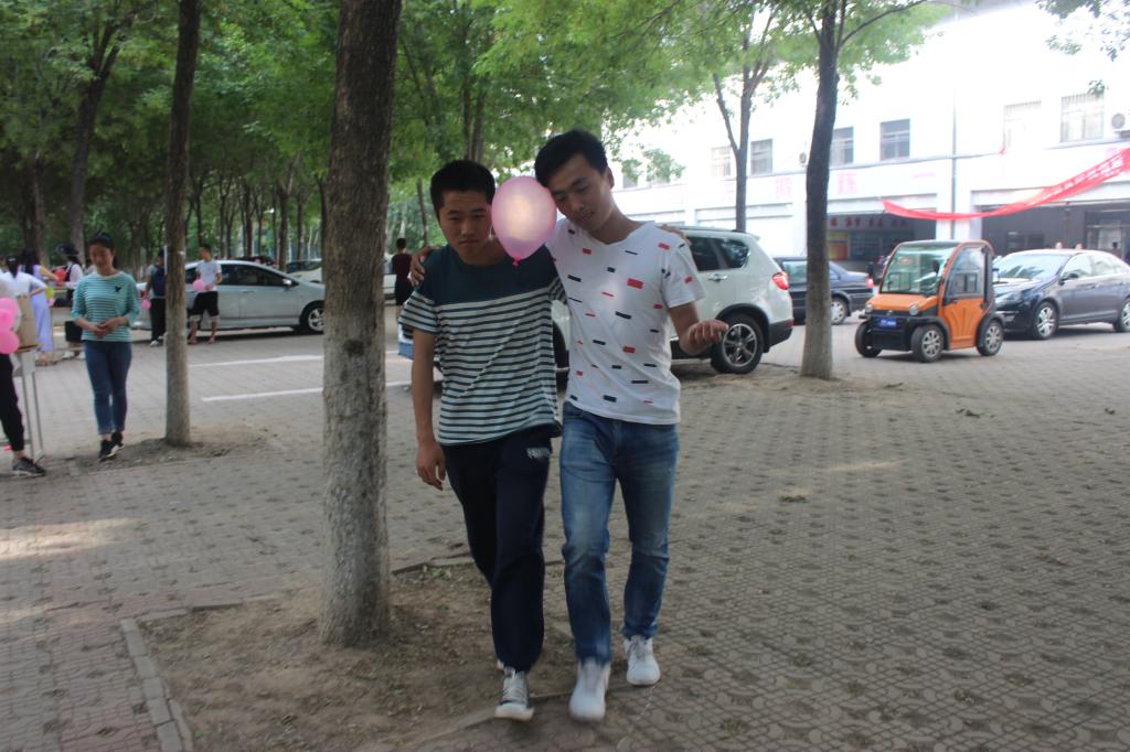 5月18日,计算机与信息工程系学生刘浩、李威在操场前小树林里参加由学前教育系承办的“气球大战”活动。