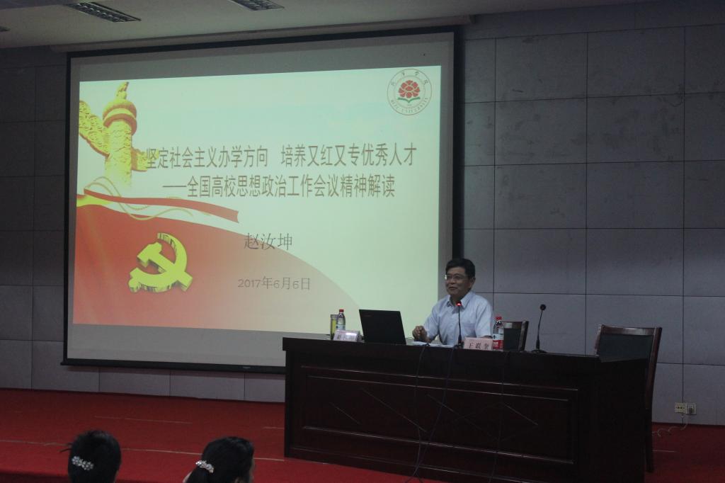 (文字编辑:王本尧)为进一步提高各系领导老师对学生的教学与管理能力,6月6日,千亿国际qy18vip党委领导代表在图书馆报告厅召开了以“坚持社会主义办学方向,培养又红又专优秀人才”为主题的全国高校思想政治工作会议精神解读报告会,出席本次会议的有党委副书记赵汝坤、学生工作处处长王联奎,计算机与信息工程系团总支书记李静,辅导员刘夏菡、王庆美等20个系的领导老师。