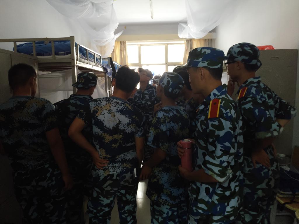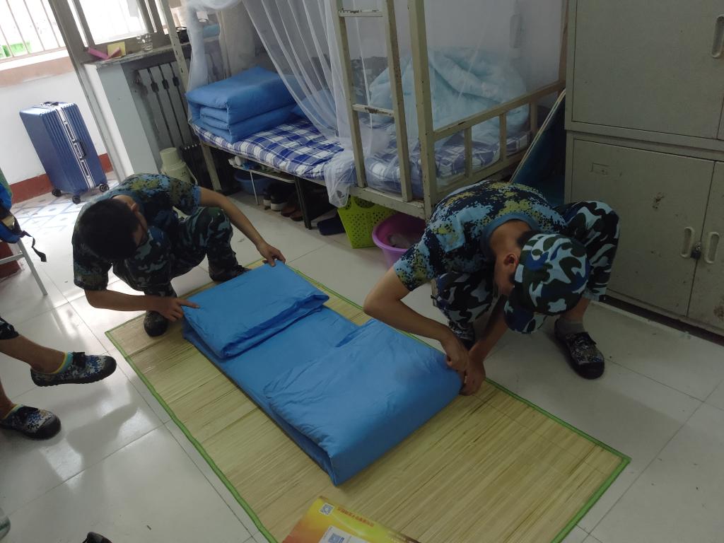 上午9点30分,全体新生在教官们的带领下,依次地离开了操场,纷纷前往宿舍整理内务。来到宿舍以后,教官们首先示范的是如何叠被子。这可能对大多数新生来说都是一项十分困难的事情,但是对于多年身在部队的教官来说,可以说是小菜一碟,没一会儿的工夫,一个“新鲜的豆腐块”就出来了。随后,教官们还精心的指导新生们如何做好卫生、怎样摆放物品等等。接下来就是新生们自己动手实践了,有的新生很有天赋,叠的被子有模有样,但是有的就不忍直视了。被子叠的好的学生会帮助叠的不好的,两个人叠一床被子,他们互帮互助,很快就完成了任务。上午11点30分,内务整理科目圆满结束。