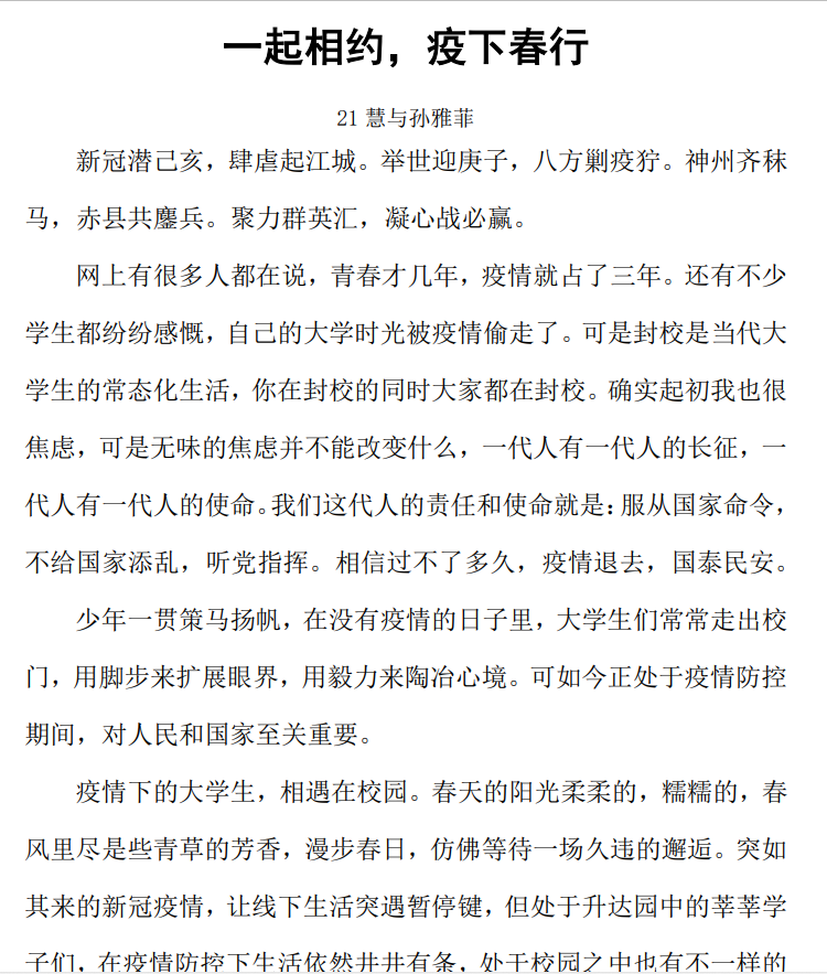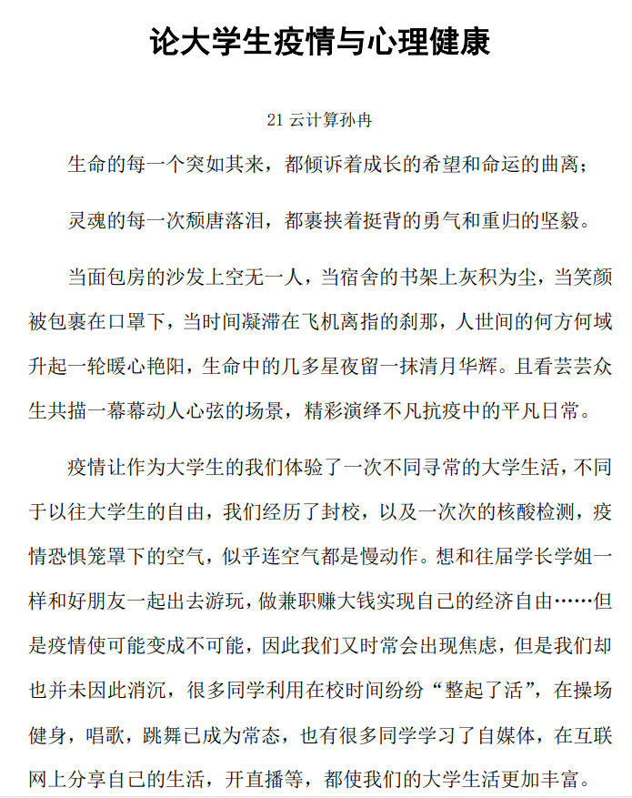 本次活动以投稿方式进行,征文以心理健康、疫情防控为主题。疫情期间,一些不良心理反应的产生往往源于对疫情的认识不足,缺乏正确的判断,本次活动的举办,可以让学生直接或者间接地科学认识疫情性质、流行情况、临床表现和危害,不过分关注负面报道,不轻信传言,不过度解读,积极关注防控信息,学习掌握防控知识,增强战胜疫情的必胜信心。经过教师评议和公开投票选出七个优秀作品: