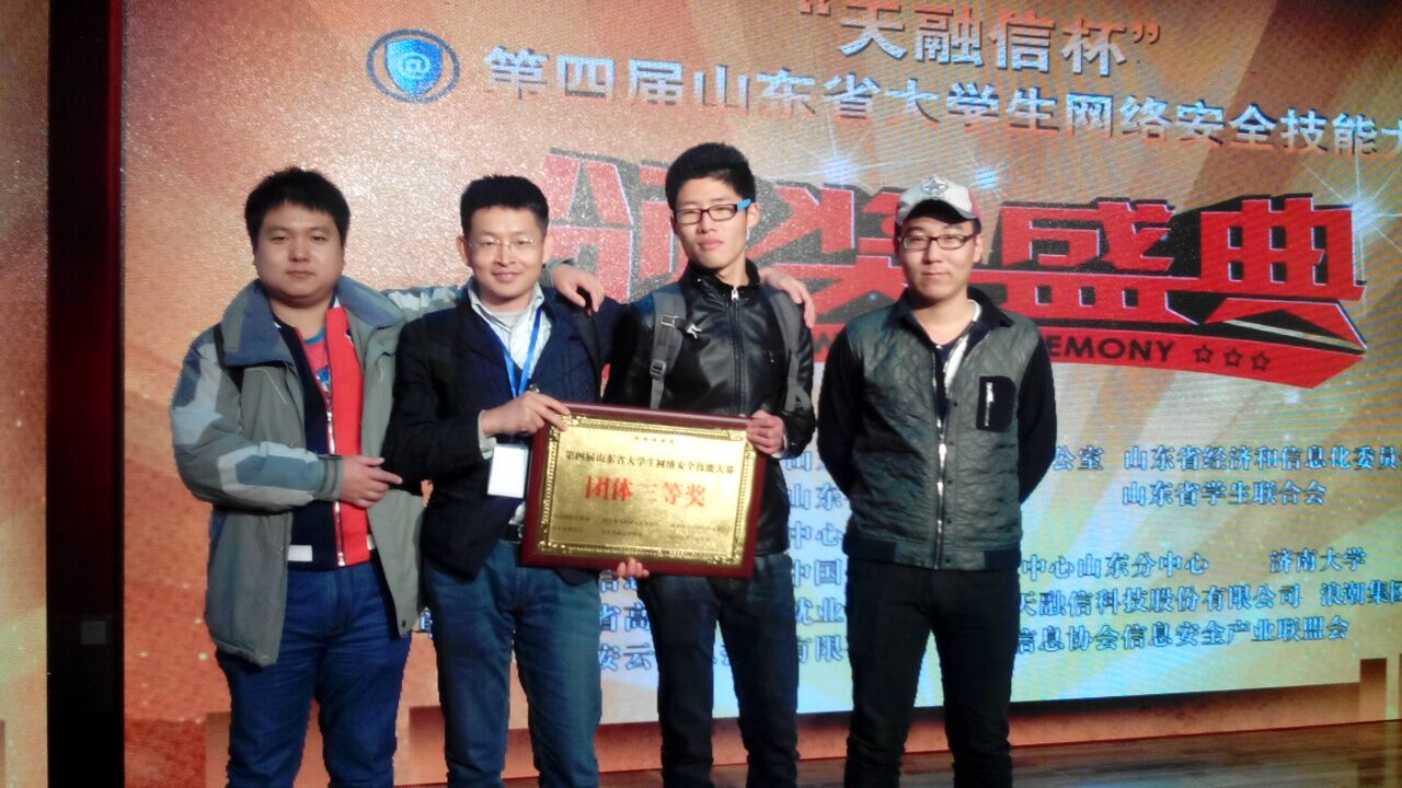 近日,由山东省教育厅和共青团山东省委主办的第四届山东省大学生网络安全技能大赛在济南大学举行,经过激烈角逐,大赛产生团体一二三等奖。山东科技大学获得一等奖,济南大学和哈尔滨工业大学(威海)获得二等奖,由我系黄文庆老师为指导,李志丹、孙卫和韩旭同学组成的代表队获得三等奖。