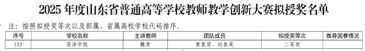 2025年6月13日,山东省教育厅公布了2025年度山东省普通高等学校教师教学创新大赛获奖名单,我院教师魏青作为主讲教师获评基础学科中级组省级二等奖。山东省普通高等学校教师教学创新大赛由山东省教育厅主办,是省内综合性最强、参与度最广的高校教学赛事之一。本届大赛以“推动教学创新、培养一流人才”为主题,深入推动高等千亿qy88国际官网入口改革。